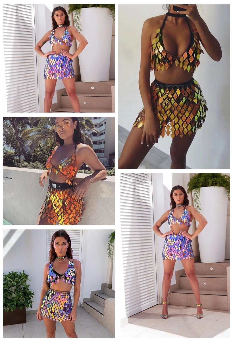 FestivalQueen Women's Sequined Crop Top and Mini Skirt Set Handcrafted Patchwork Party Outfits Clubwear Sexy 2 Pcs