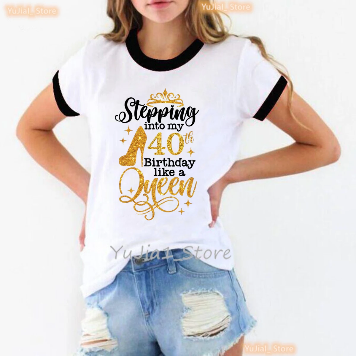 Glitter Stepping Into My 30th/40th Birthday Like A Queen Printed T Shirt Femme High Shoes Birthday Gift Tshirt Women T-Shirt