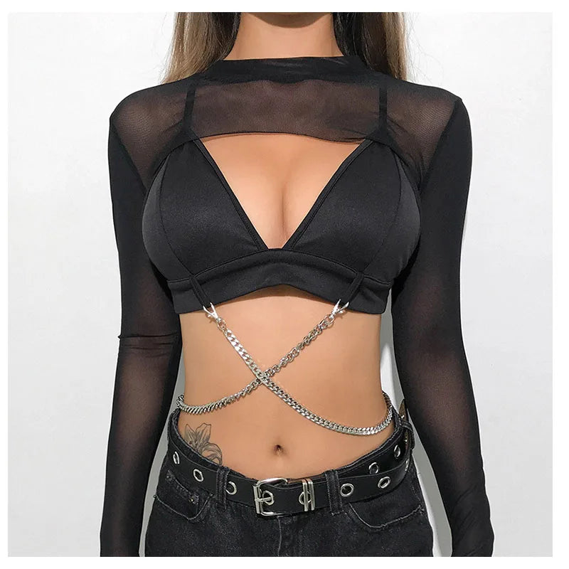 Sexy Women Crop Top Mesh Sleeve T-Shirt Sexy Tops Hollow Out Transparent Tops Ladies T Shirt Black Top Casual T-shirt Tee Shirts